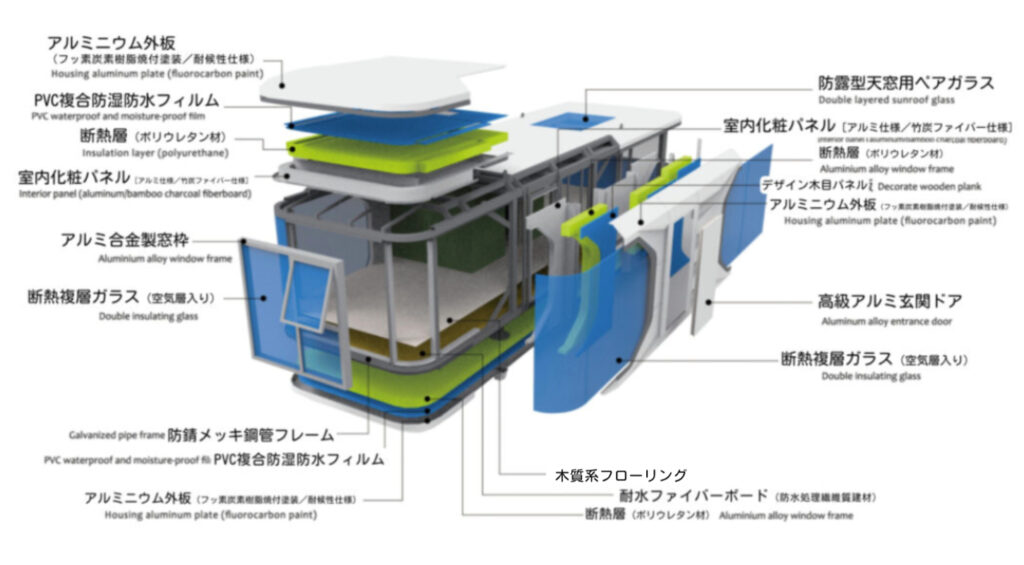 高級グランピングハウス「AOZORA」シリーズでは、日本の四季に対応した長期間使用できる耐久性と夏や冬でもエアコンなどが機能して過ごしやすい断熱性・気密性に重点を置いた「AOZORA」オリジナル基本構造となっています。また、電気や付帯設備は日本規準対応仕様となっておりますので将来の消耗品交換やアフターメンテナンスもご安心頂けます。