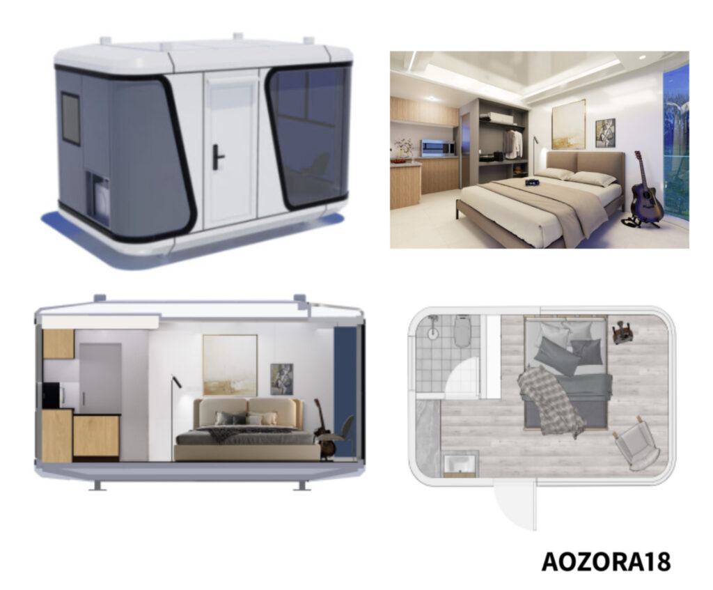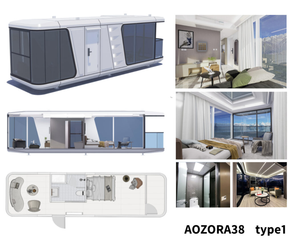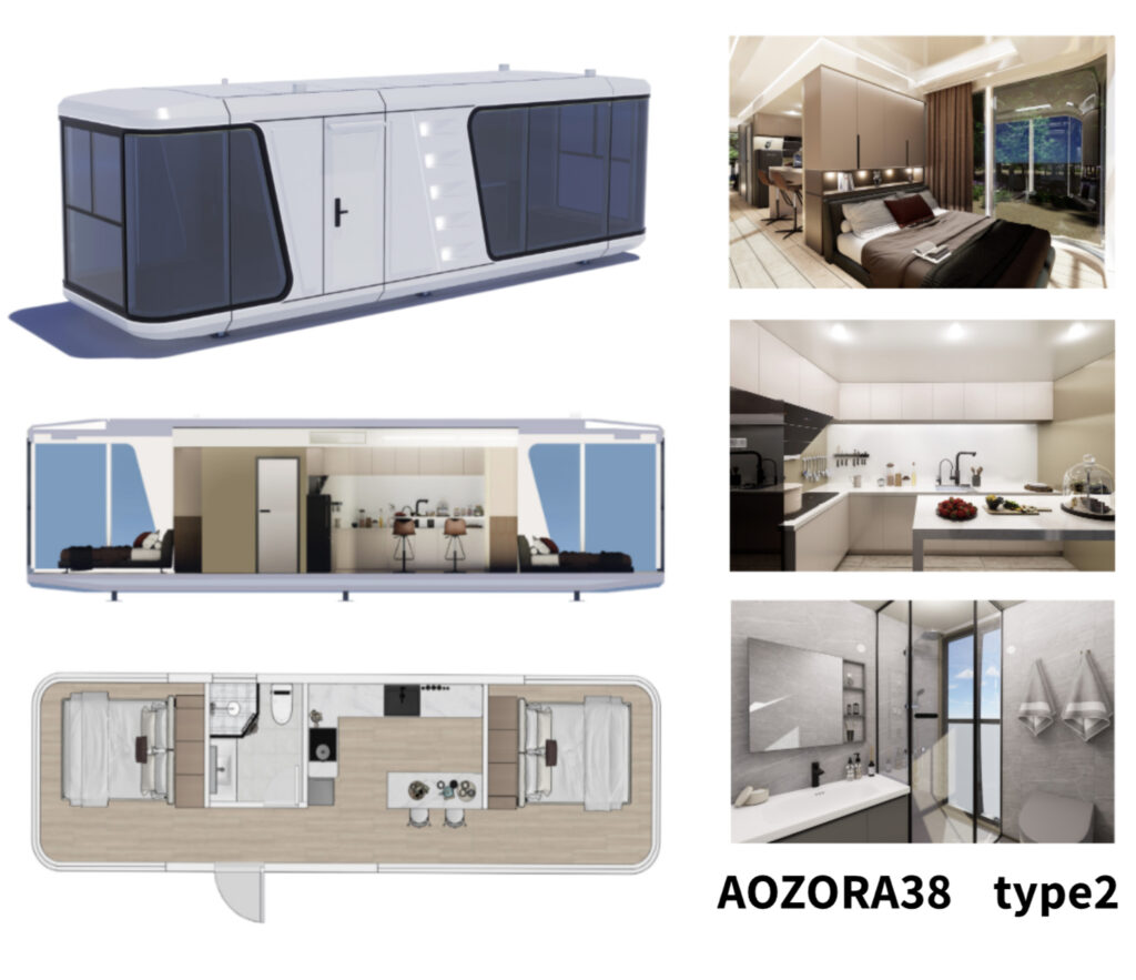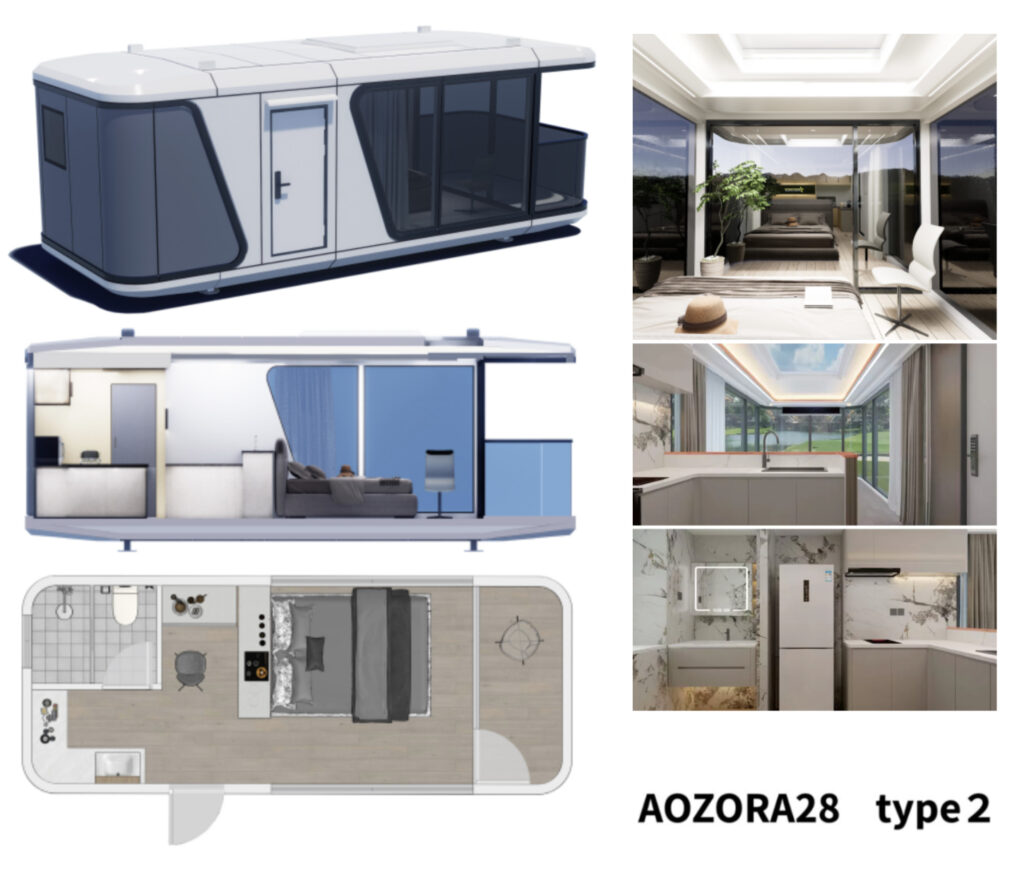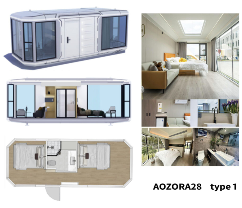 上記画像の商品は、ご注文が最も多い高級グランピングハウス「AOZORA28 type1」という2部屋+シャワー・トイレ・洗面付きタイプ:床面積28㎡です。主に民泊運営や宿泊施設運営をされている方々に大変ご好評頂いております。