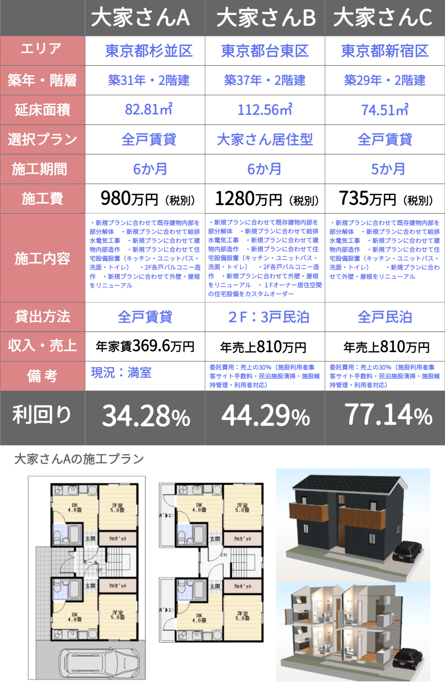 ※大家さんAの記載利回りは、施工費(投資資金)に対しての家賃収入をもとに算出した2024年3月~2025年3月の実際の表面利回り(税引き前・賃貸管理費除く)となります。