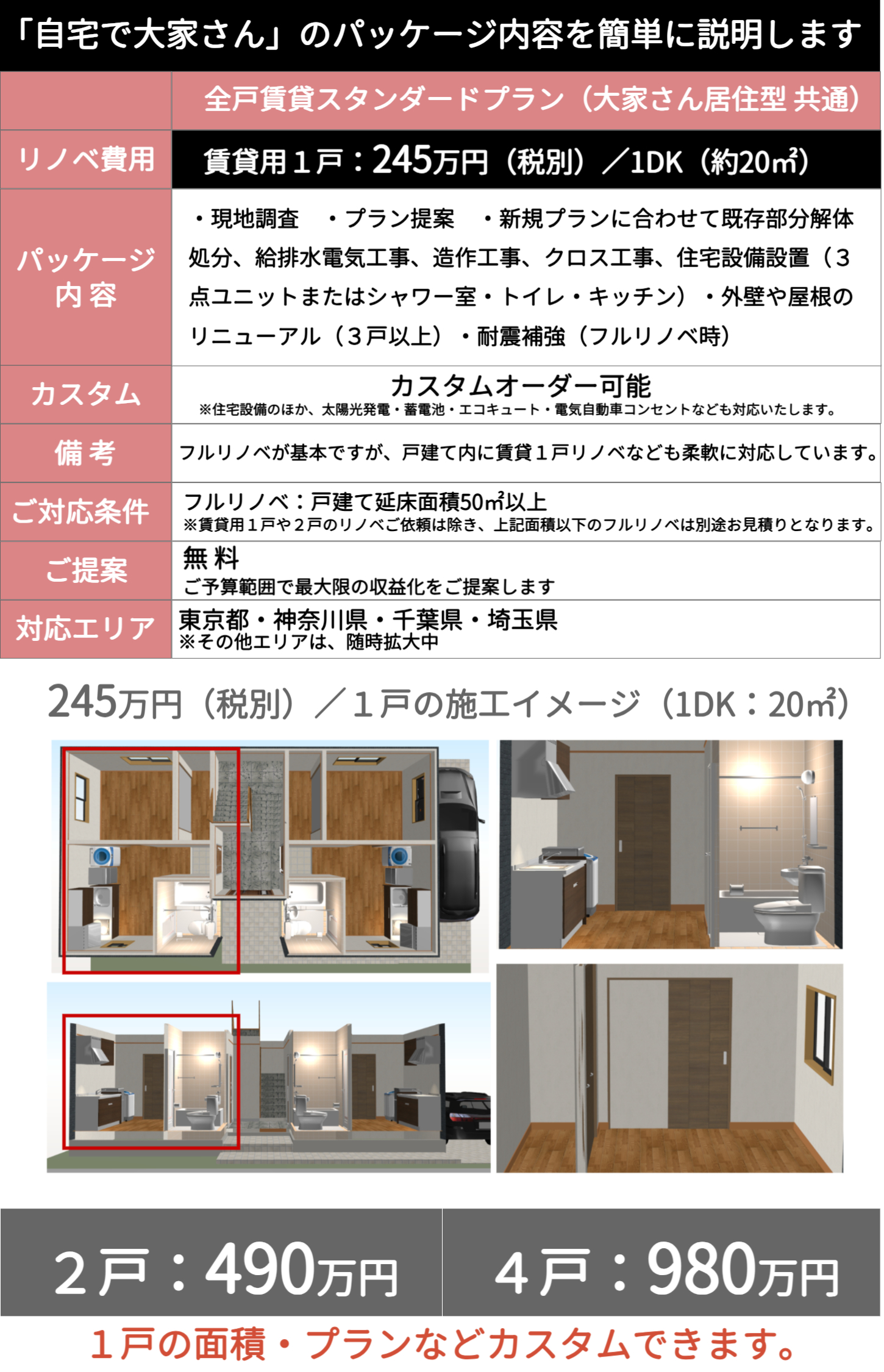 賃貸用1戸(1DK20㎡)をリノベ換算でわかりやすい料金をパッケージ化。「自宅で大家さん」は、フルリノベパッケージですが部分リノベにも対応しています。また、パッケージ料金をもとにお客様の既存戸建て・お客様ご希望に合わせたリノベプランに変更したり、立地や集客などを意識した1LDKなど幅広くプランご提案をしております。