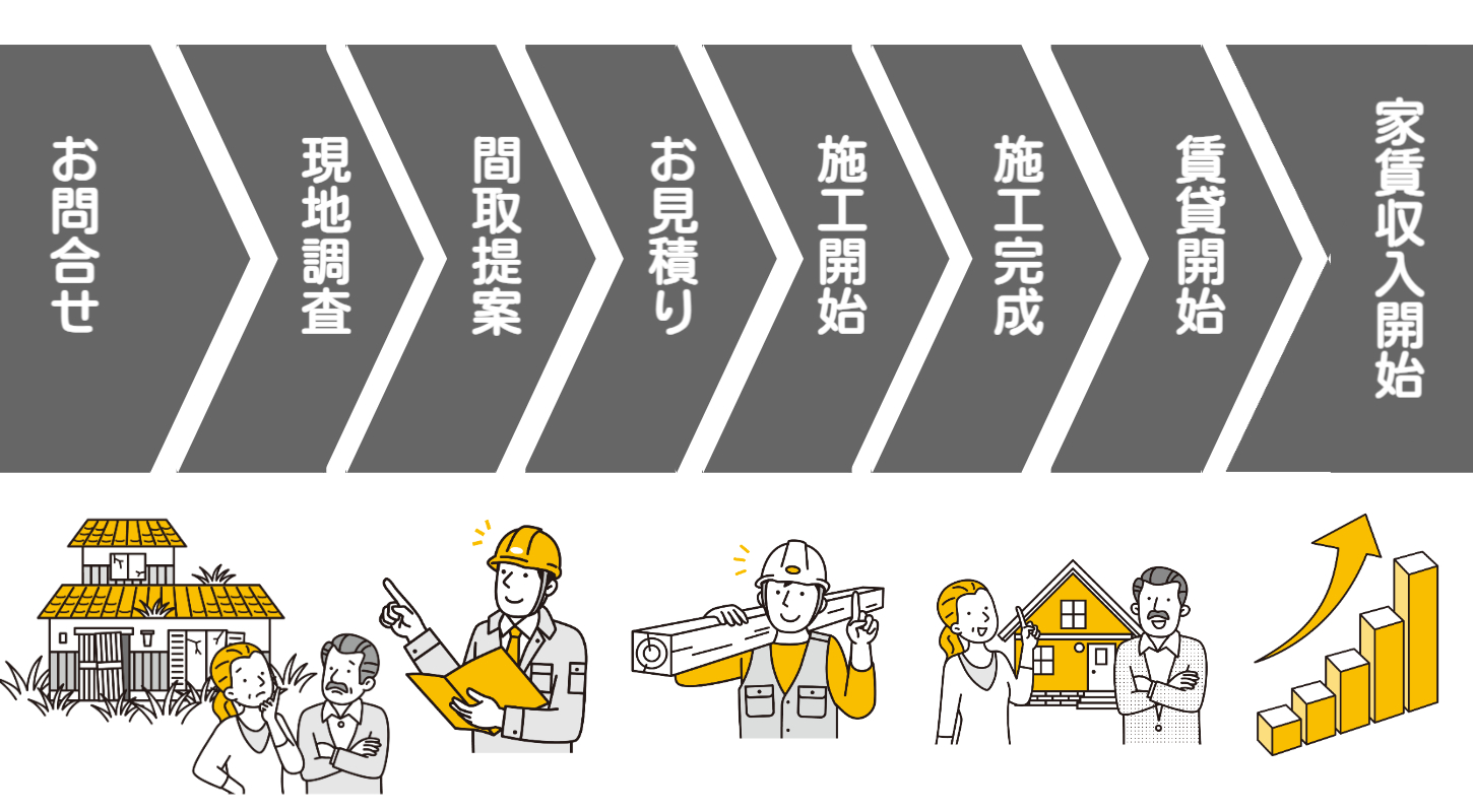「自宅で大家さん」お問合せから施工そして家賃収入開始までの主なスケジュールをご紹介します。